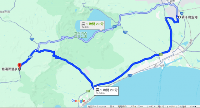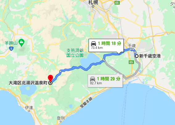 北海道の空の玄関口、新千歳空港から北湯沢までの距離は一般道を通って約73.4km。