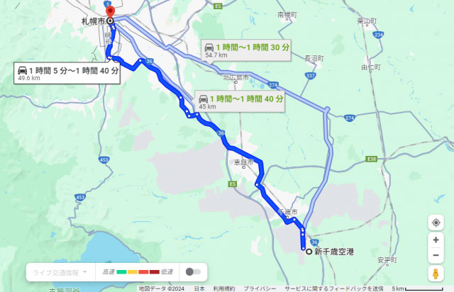 新千歳空港から札幌までの距離は、短いルートだと約44㎞。