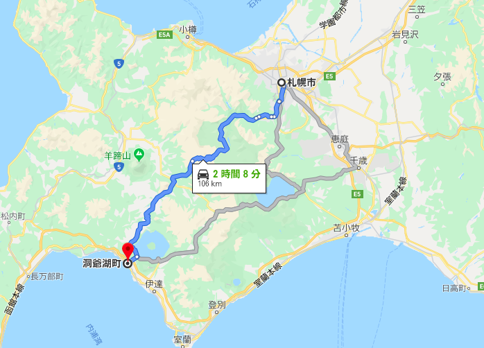 札幌から洞爺湖までの距離は一般道を通って約106km、約2時間8分の道のりです。